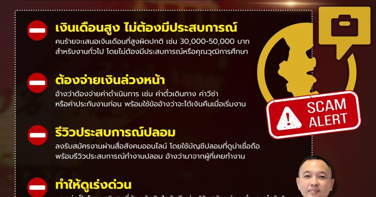 ⚠️ 1. เงินเดือนสูง ไม่ต้องมีประสบการณ์ – คนร้ายจะเสนอเงินเดือนที่สูงผิดปกติ เช่น 30,000-50,000 บาท สำหรับงานทั่วไป โดยไม่ต้องมีประสบการณ์หรือคุณวุฒิการศึกษา