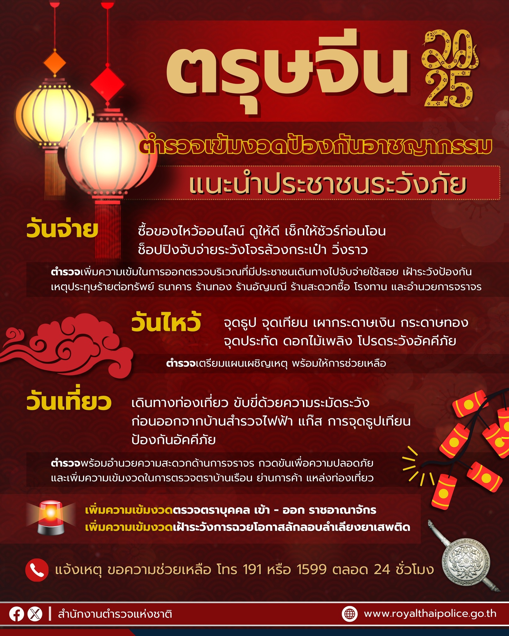 สำนักงานตำรวจแห่งชาติมีมาตรการเข้ม ดูแลประชาชนช่วงเทศกาล #ตรุษจีน 2568 ทั้งวันจ่าย วันไหว้ วันเที่ยว แนะระมัดระวังภัย 🧧