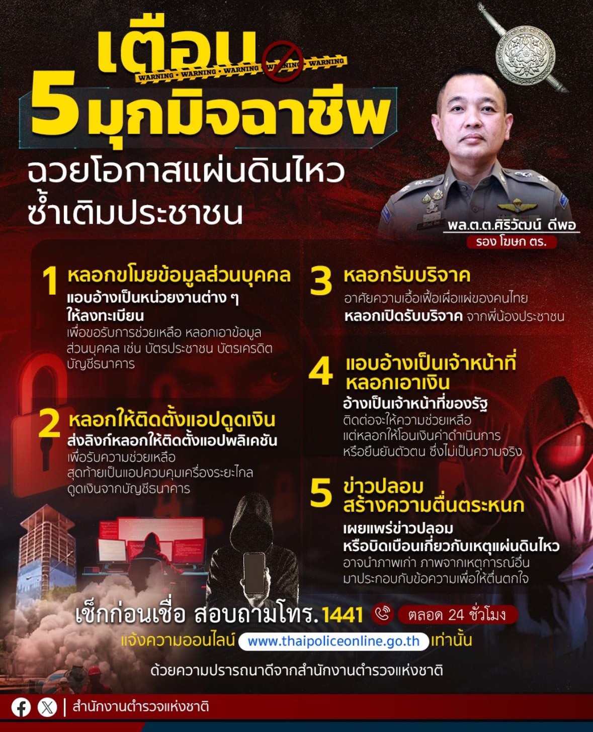 🚨สำนักงานตำรวจแห่งชาติ เตือน 5 มุกมิจฯ ฉวยโอกาสแผ่นดินไหว ซ้ำเติมประชาชน