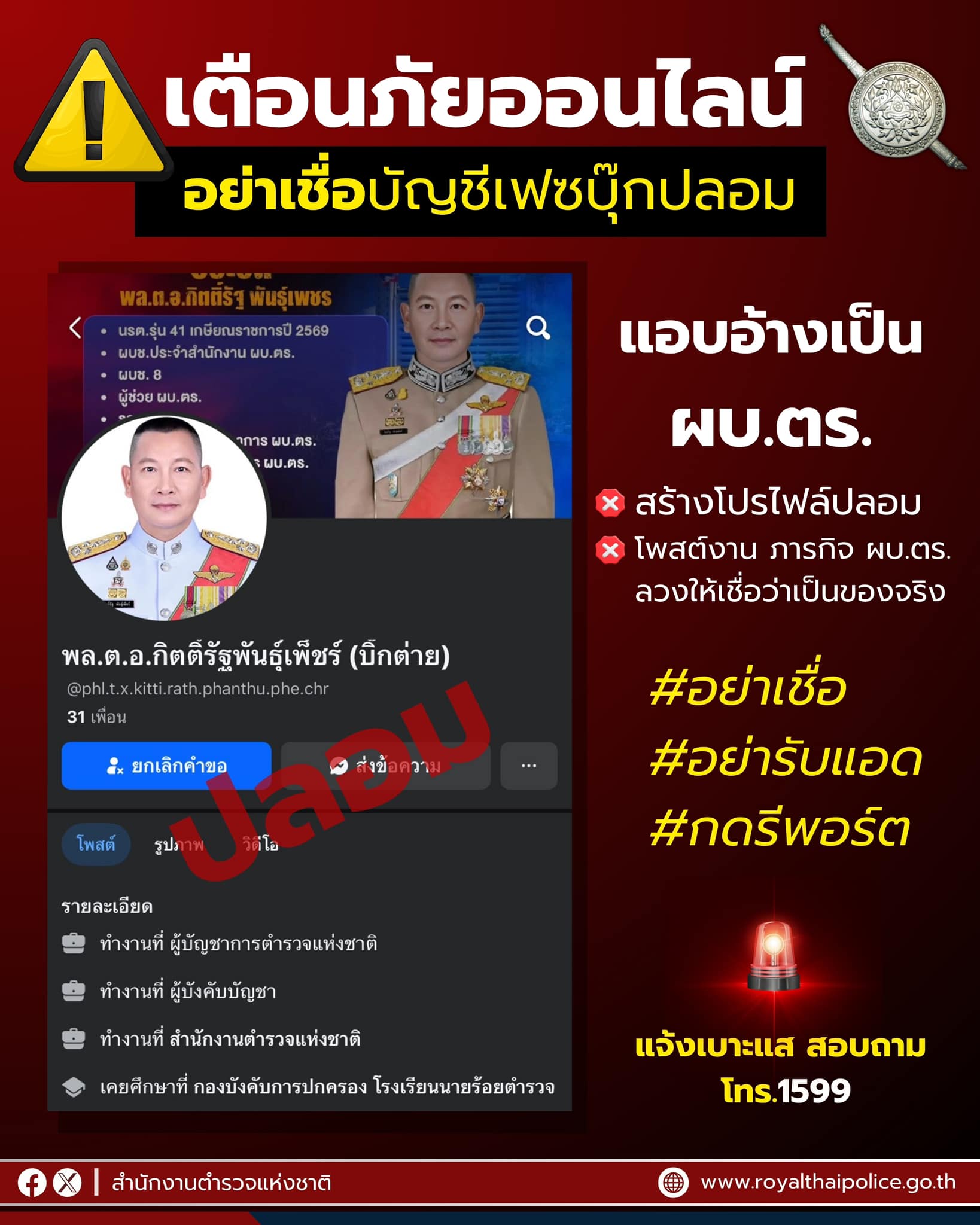 ⚠️ อย่าเชื่อ อย่ารับแอด กดรีพอร์ต “บัญชีเฟซบุ๊กปลอม” แอบอ้าง เป็น ผบ.ตร.