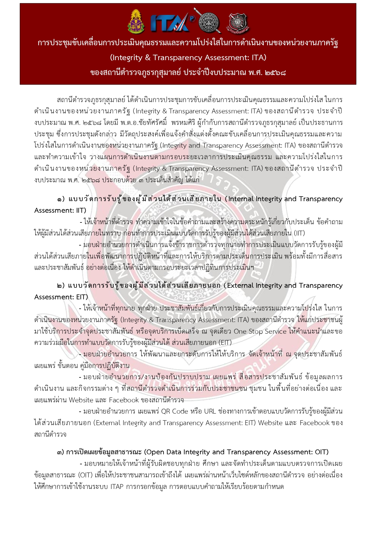การเตรียมความพร้อมรับการประเมินคุณธรรมและความโปร่งใสในการดำเนินงานของหน่วยงานภาครัฐ (Integrity & Transparency Assessment: ITA) ของสถานีตำรวจนครบาล/สถานีตำรวจภูธร ประจำปีงบประมาณ พ.ศ. 2568 ได้แก่
