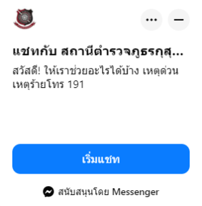 ช่องทางการถาม-ตอบ/ช่องทางการรับฟังความคิดเห็น แนะนำ หรือติชม ผ่าน Facebook Messenger Live Chat  ตำแหน่งอยู่มุมขวาล่างของเว็บไซต์